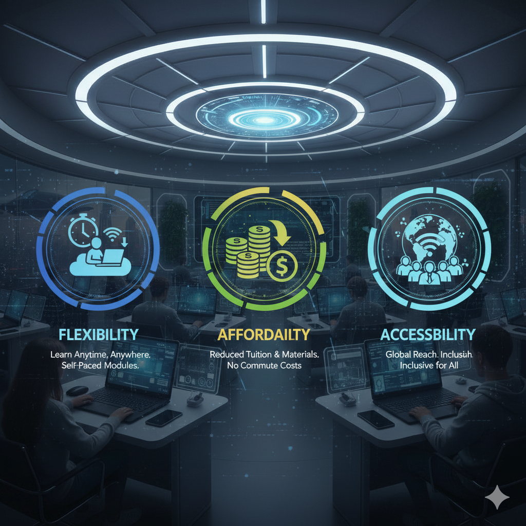 Online courses often reduce expenses related to travel, accommodation, and physical textbooks.